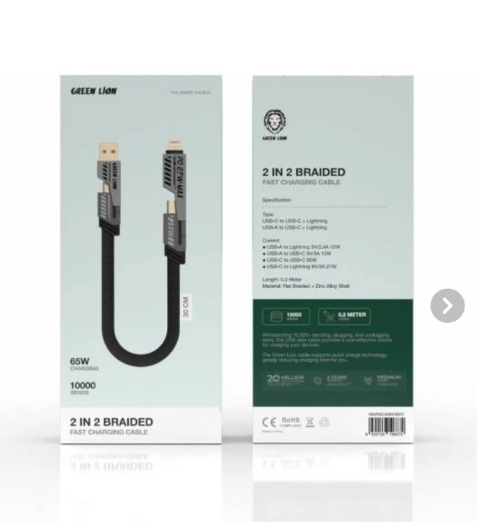 کابل شارژ گرین لاین چهار کاره (همه کاره )مدلGREEN LION 2 IN 2 BRAIDED